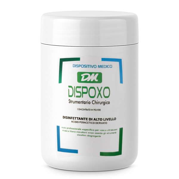 Dispoxo è fornito in confezione da 1000 grammi ed è pensato per un uso professionale intensivo. La sua formulazione contiene: sodio percarbonato 53,0 g, TAED 23,0 g, acido citrico anidro 11,0 g, enzimi, sequestranti, antiossidanti ed anticorrosivi q.b. a 100 g. Il prodotto viene dosato al 2% (20 g per ogni litro d’acqua) utilizzando l’apposito misurino incluso nel barattolo. La soluzione è attiva dopo 15 minuti dalla preparazione e rimane efficace per 24 ore. Gli strumenti devono essere immersi per almeno 10 minuti, estendibili a 15 minuti in caso di sporco elevato. Dopo il trattamento è necessario risciacquare e asciugare accuratamente gli strumenti prima della sterilizzazione.
